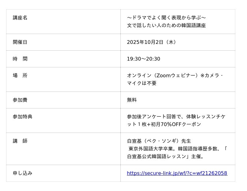 ●初心者向けのやさしい韓国語講座「~ドラマでよく聞く表現から学ぶ~文で話したい人のための韓国語講座」を2025年10月2日(木)19時30分~20時30分にオンラインで無料開催