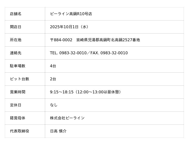 株式会社オートバックスセブン(代表取締役 社長:堀井勇吾)の連結子会社(孫会社)である株式会社ビーライン(代表取締役:日高慎介)は、「ビーライン新富店」を移転し、「ビーライン高鍋R10号店」として2025年10月1日(水)にオープンいたします。