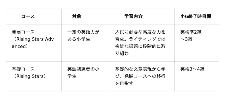 The Rising Stars program is designed so that students can move from Foundations to Advanced, steadily building the skills needed for junior high school entrance exams. This framework builds on KA’s long experience not only in maintaining but also advancing the English abilities of returnee students.