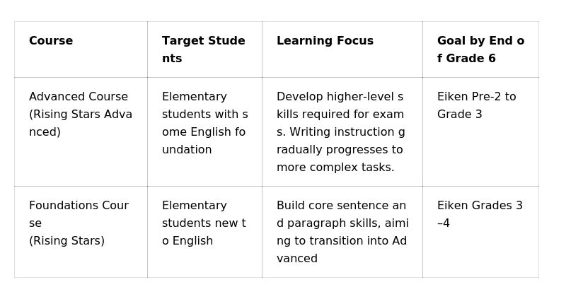 Rising Stars is designed for elementary school students (Grades 1-6), with the first year focusing on Grades 3-5. Placement is determined by an English proficiency assessment conducted before enrollment.