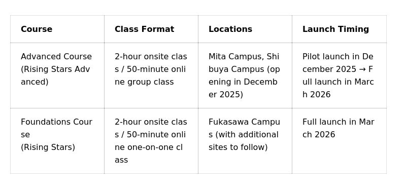"With the launch of Rising Stars, we are bringing the expertise that has helped returnee students succeed for decades to a new generation of learners in Japan. By combining the strengths of Kikokushijo Academy and Global Step Academy, we can help motivated beginners build strong foundations, grow in confidence, and gain the advantage they need to pursue the best opportunities at home and abroad."