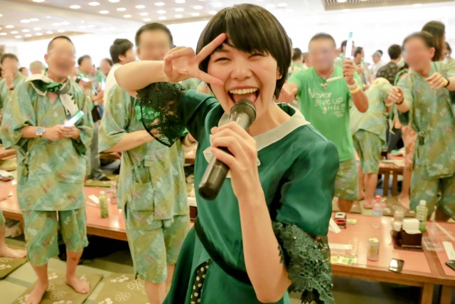 さぁ、ここからはラストスパートです。Negiccoの初期を歌った楽しくも切ない『15』(いちご)を歌いながら、会場を練り歩きます。ファンの皆さんはびっくり&大喜び! Negiccoの会場練り歩きは、本当に大きな武器ですね。会場の外は、いつの間にか大雨。宴会場の天国ぶりとは本当に対照的です。