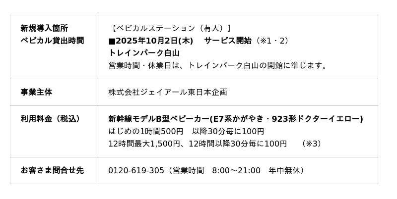 ○この度、10月2日より北陸新幹線の車両基地である白山総合車両所に隣接した体験型施設「トレインパーク白山」でベビーカーのレンタルサービスを開始いたします。ベビーカーは、お子さまに大人気の新幹線モデルベビーカー(B型)を貸出いたします。