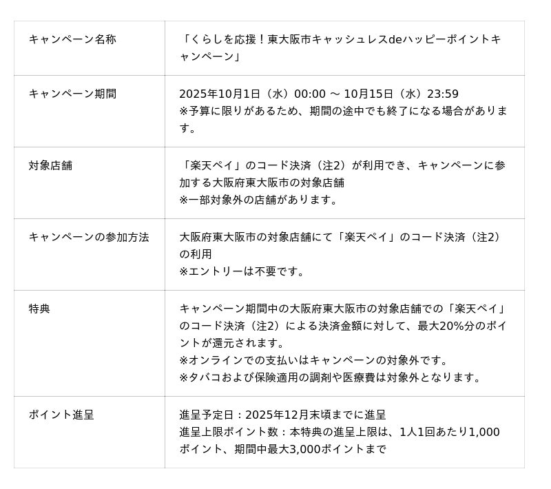 楽天ペイメント株式会社(以下「楽天ペイメント」)は、運営するキャッシュレス決済サービス「楽天ペイ」において、大阪府東大阪市が2025年10月1日(水)から10月15日(水)まで実施する「くらしを応援!東大阪市キャッシュレスdeハッピーポイントキャンペーン」に参加することをお知らせします。