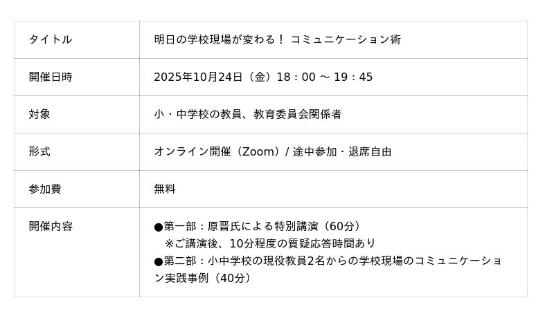 学校の先生方は、主任や係を担当するベテランから若手までさまざまな立場から、各校の目指す目標に向かってチームを組み、児童生徒の指導や働き方改革など学校内の多様な課題に日々取り組まれています。本ウェビナーでは、各種行事などで学校が多忙のピークを迎える秋に向け、「現場を元気にする」チーム作りやコミュニケーションの秘訣や、具体的な実践事例をお届けすることを通して、日々の学校運営のご支援につなげていきたいと考えています。