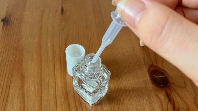 ネイルのような瓶ですが、ハケはなく付属のスポイトで中の液体を吸い上げて使います。