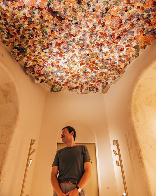 その相互作用は、ピエルマッテイがブティックの各階のために制作し、3Dのヴォールトにインスパイアされたオーダーメイドのアートワークから生まれました。着色されたセメントと絞り袋を使用し、素材を本来の硬い感触から柔らかい痕跡へと変化させ、手作業による装飾的なジェスチャーを行い、それをフェンディのファー職人とピエルマッテイによる独自の象嵌細工を用いて、レザーおよびファーのタブレットに転写します。