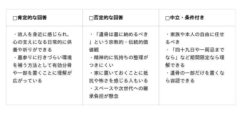 ◇一方で、宗教的価値観や心理的負担から遺骨を自宅へ置くことへの嫌悪感を持っていると捉えられる層も一定数存在。
