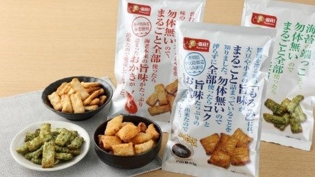 (一例)海老の頭や殻、海苔の端材、しょう油を搾る前のもろみを使用した「E-WA!素材おかき 海老・海苔・醤油」