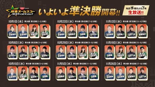 国内主要大会のタイトルホルダーや麻雀プロ団体のスター選手が集い、国内個人タイトル戦として最高額となる賞金総額1,000万円をかけて戦うこの大会では、10月1日(水)より準決勝が始まります。これまで各予選ブロックを勝ち抜いた8名と、敗者復活戦で勝利した1名を合わせた計9名でのリーグ戦となります。