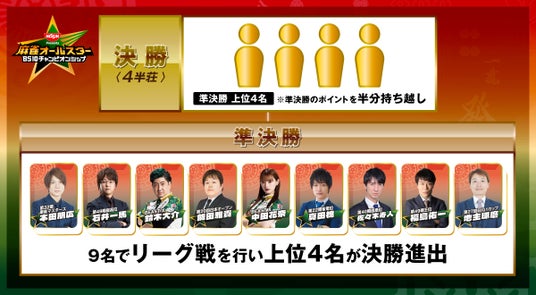 現Mリーガーと5名と、各団体のプロ雀士4名によって行われる準決勝。