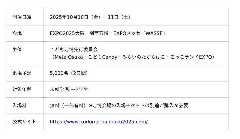 ※「未来のトビラをひらく『こども万博』」は株式会社Meta Osaka(こどもCandy)、株式会社ママそら(みらいのたからばこ)、株式会社キッズスター(ごっこらんどEXPO)の3社による共創プロジェクトとして開催。