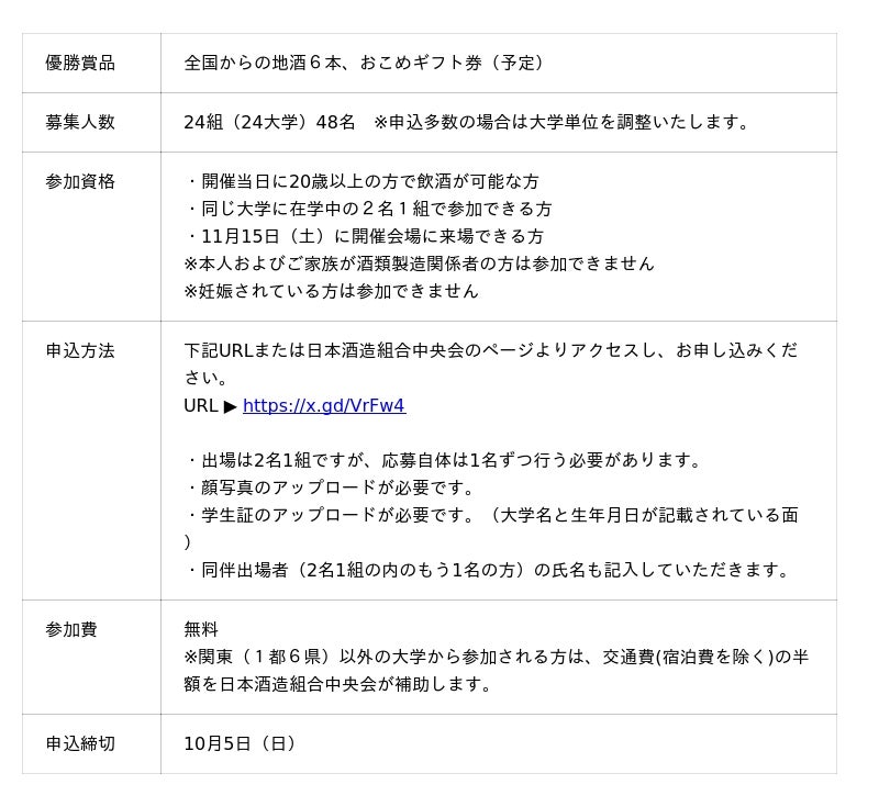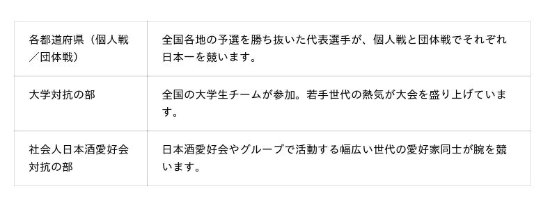全国の地方予選を勝ち抜いた代表選手たちは、11月15日(土)に東京都千代田区で開催される全国大会本戦に集結し、日本一の座をかけて競い合います。また、きき酒競技を通じ日本酒の魅力を幅広い層へ体験して頂く機会として、大学生きき酒日本一を決める「大学生対抗の部」と、昨年より新設された「社会人日本酒愛好会対抗の部」を特別枠として設けており、さらなる熱戦が期待されます。