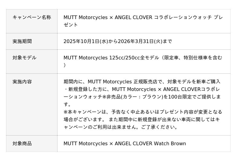 マットモーターサイクルズの日本正規代理店「マットモーターサイクルズジャパン(総輸入発売元:ピーシーアイ株式会社 代表取締役社長 高橋一穂)」は、2025年10月1日から2026年3月31日までの期間中、 MUTT Motorcycles(マットモーターサイクルズ)正規販売店で、対象モデルを新車ご購入・新規登録された方に、MUTT Motorcycles × ANGEL CLOVER(エンジェルクローバー)コラボレーションウォッチ ※非売品(カラー:ブラウン)を100台限定でプレゼントするキャンペーンを実施します。