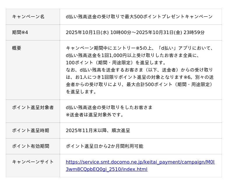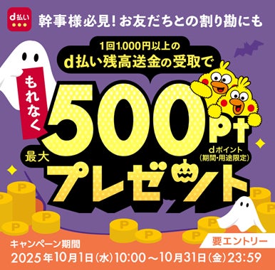 株式会社NTTドコモ(以下、ドコモ)は、「d払い残高送金の受け取りで最大500ポイントプレゼントキャンペーン」を、2025年10月1日(水)から10月31日(金)まで開催します。「d払い(R)」アプリにおいて、d払い残高送金※1を1回1,000円以上受け取り※2※3したお客さまに、もれなく最大合計500ポイント(期間・用途限定)を進呈します。