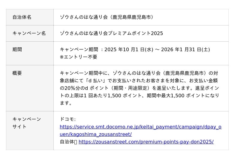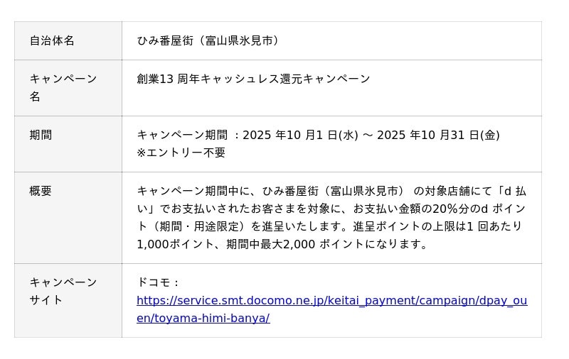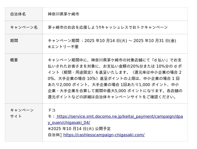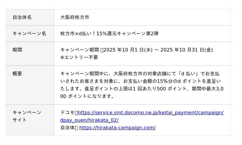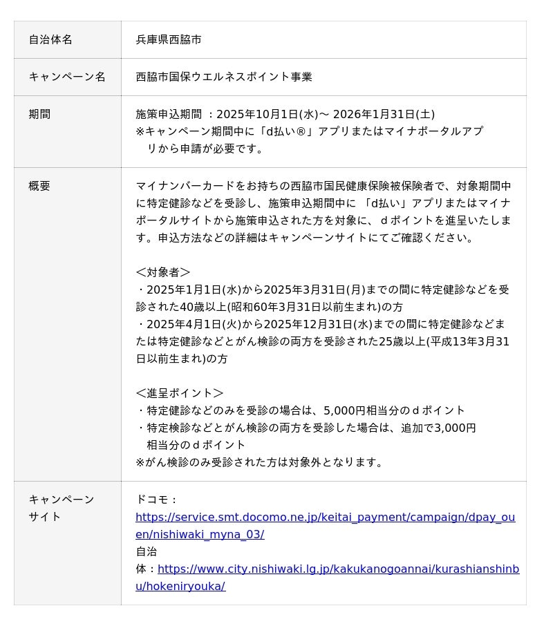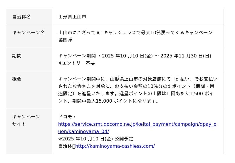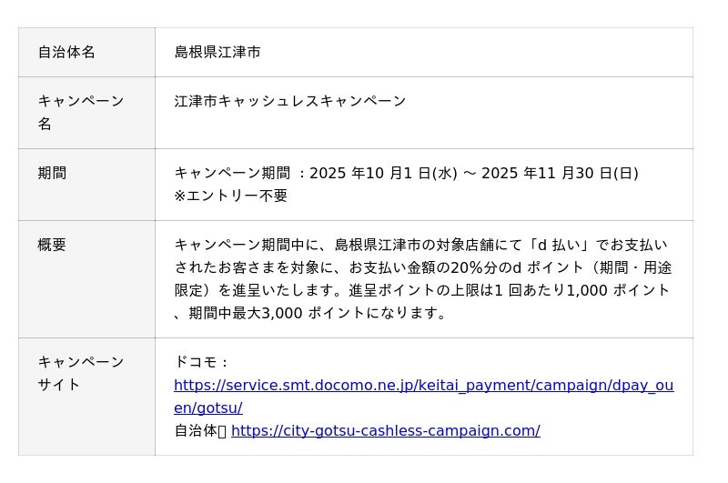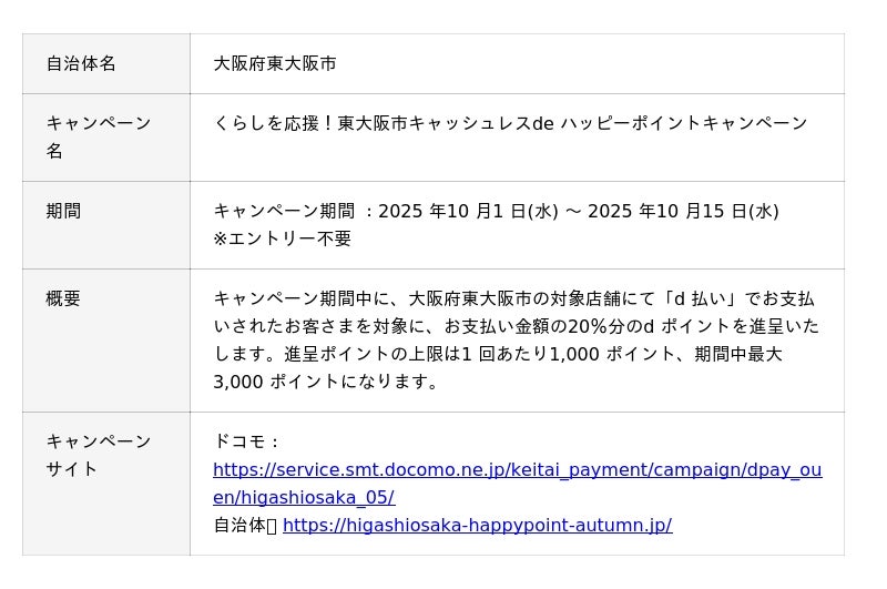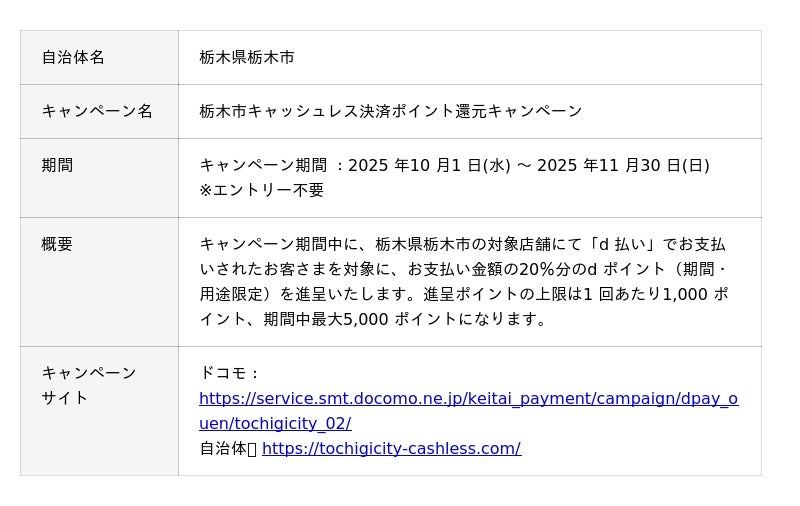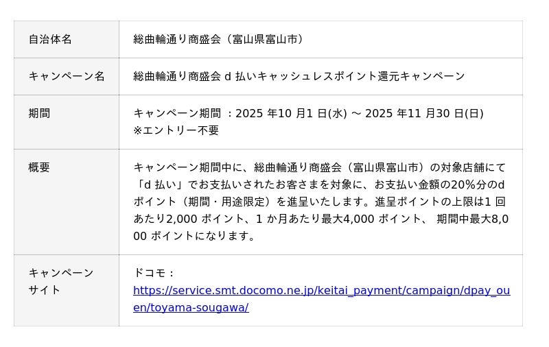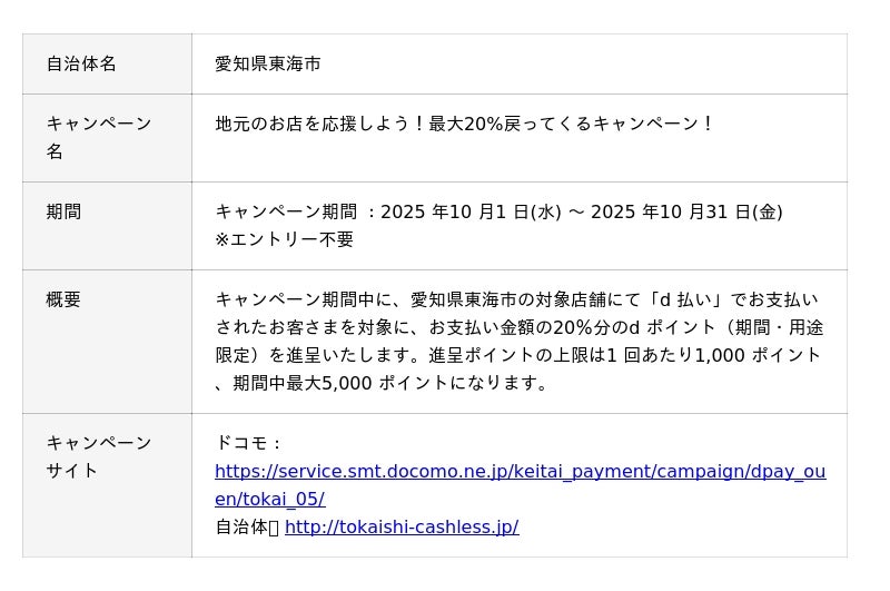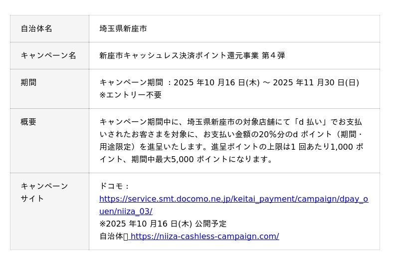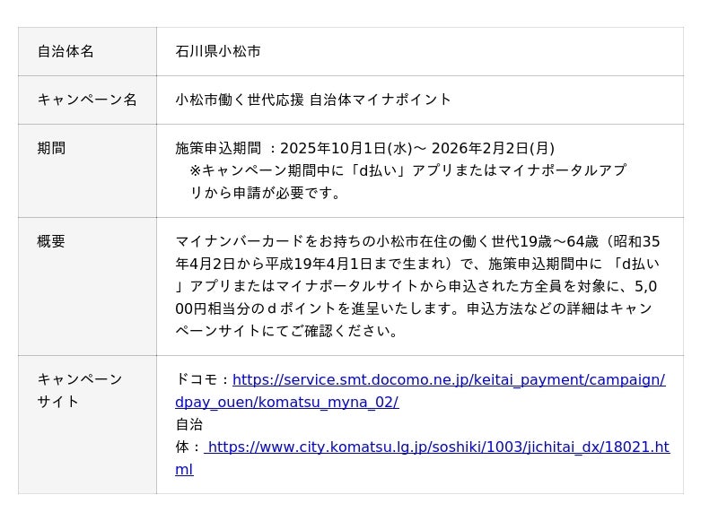 株式会社NTTドコモ(以下、ドコモ)は、全国の自治体においておトクなキャンペーンを開催いたします。詳細は、下表のとおりです。