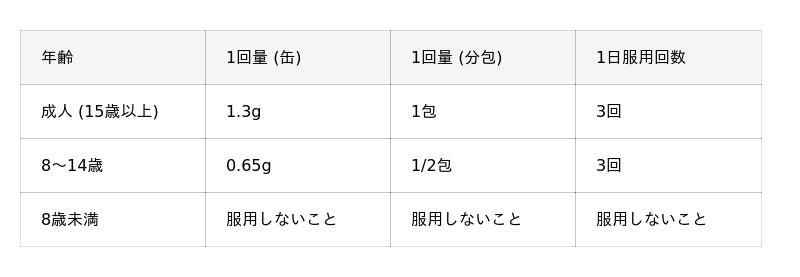 次の量を食後又は食間に水又はぬるま湯で服用してください。