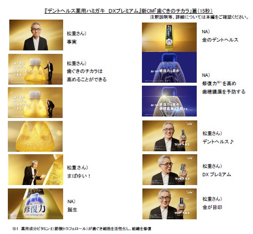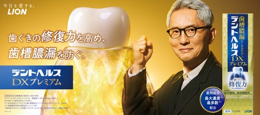 そこでこの度、薬用成分を最大濃度(※4)・最多数配合(※5)し、歯ぐきの修復力(※1)を高め、歯槽膿漏を防ぐ『デントヘルス薬用ハミガキ DXプレミアム』を新発売いたします。新CMでは、その演技力の高さで知られる俳優、松重 豊さんを起用しました。松重さんならではの豊かな表情と説得力ある演技で、『デントヘルス薬用ハミガキ DXプレミアム』が歯ぐきの修復力を高めて歯槽膿漏を予防することを力強くお伝えします。