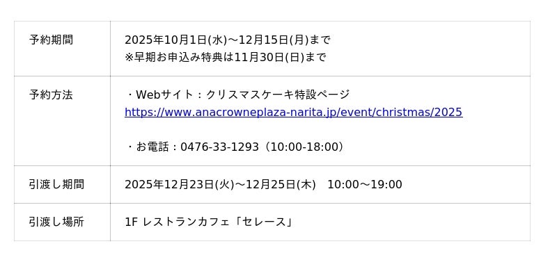 ANAクラウンプラザホテル成田(成田市堀之内 総支配人 ダヴィデ・ザナルディ)では、10月1日(水)よりクリスマスケーキの予約受付を開始いたします。