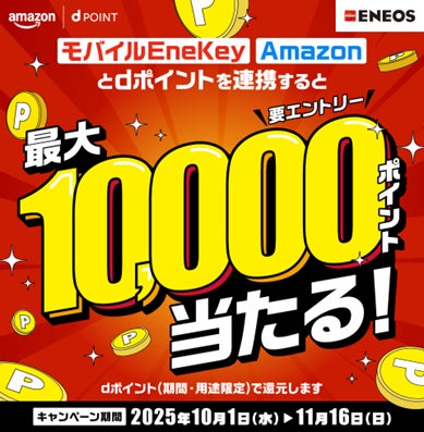 株式会社NTTドコモ(以下、ドコモ)は「モバイル EneKey」および「Amzon アカウント」とdアカウントを連携すると、抽選でdポイントが最大10,000ポイント当たる「dアカウントと【モバイル EneKey】【Amazon アカウント】を連携して、最大10,000ポイント当たるキャンペーン」(以下、本キャンペーン)を2025年10月1日(水)から2025年11月16日(日)までの期間で開催※1いたします。