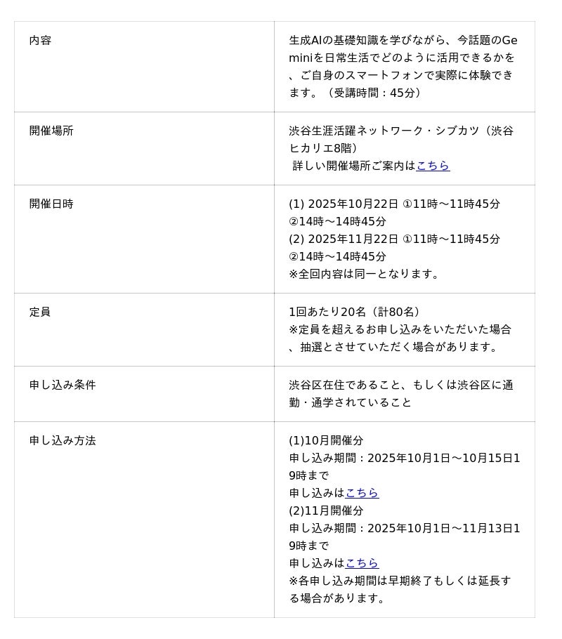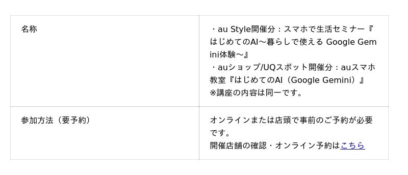 KDDI株式会社(本社:東京都港区、代表取締役社長 CEO:松田 浩路、以下 KDDI)は2025年10月1日から、東京都渋谷区(区長:長谷部 健、以下 渋谷区)と共同で開催する体験型セミナー「はじめてのAI~暮らしで使える Google Gemini体験~supported by au」(以下 本セミナー)の申し込み受付を開始します。