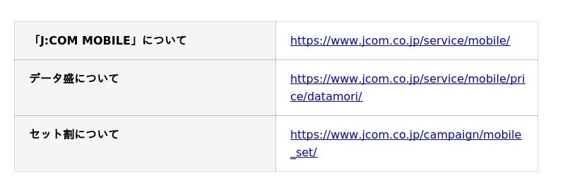 ※1 データ盛適用で1GBがデータ増量で5GB、5GBがデータ増量で10GB、10GBがデータ増量で20GB、20GBがデータ増量で30GB、50GBがデータ増量で60GB。適用条件はこちら(https://www.jcom.co.jp/service/mobile/price/datamori/)