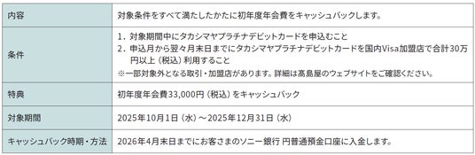 ソニー銀行株式会社(代表取締役社長:南 啓二/本社:東京都千代田区/以下 ソニー銀行)は、株式会社高島屋(代表取締役社長:村田 善郎/本社:大阪市中央区/以下 高島屋)と「タカシマヤプラチナデビットカード初年度年会費33,000円キャッシュバックキャンペーン」を2025年10月1日(水)より実施しますのでお知らせします。