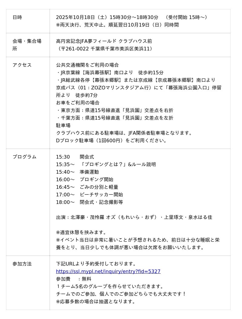 一般社団法人海と日本プロジェクトin千葉県(千葉県千葉市中央区、代表理事:麻生恵 以下、当団体)は、2025年10月18日(土)に、千葉県幕張にてプロギング×ビーチサッカーのイベント「PLOGGING MAKUHARI PLUS+ 2025」(以下、本イベント)の第3回イベントを開催いたします。本イベントは、日本財団が推進する海洋ごみ対策プロジェクト「海と日本プロジェクト・CHANGE FOR THE BLUE」の一環で開催するものです。