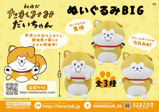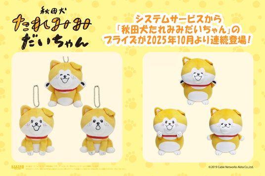 システムサービス株式会社(本社:東京都豊島区、代表取締役社長:田村宗弘)は、「秋田犬たれみみだいちゃん」のプライズ商品を2025年10月より順次アミューズメント施設にて展開いたします。