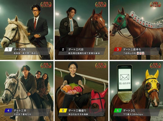 婚活女子の本命であり、“高身長・高学歴・高収入”を誇る「ダート3高」。総合商社を経て家業を継承した「ダート三代目」、待ちの広さに定評の「ダート3面待ち」、若者の支持を集める人気タウン「ダート三茶」など、競馬ファンならずとも注目せずにいられない、個性的過ぎるジョッキー6名が登場。それぞれが持ち前の能力を発揮して、予測不能のレースを繰り広げます。