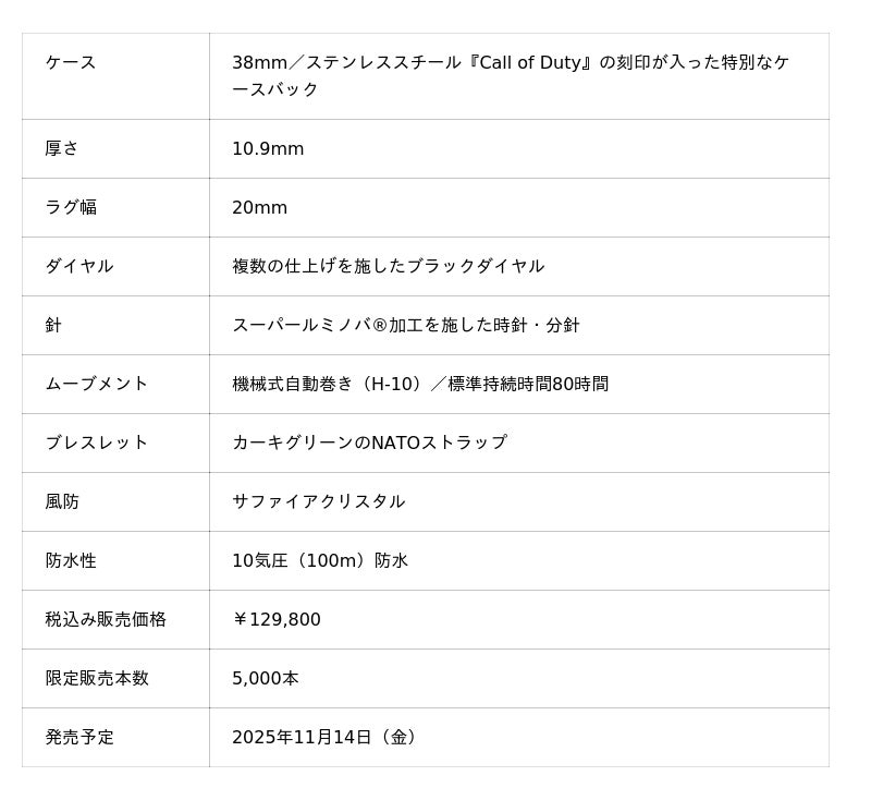 ステンレススチール製ケース、ブラックダイヤル、そして暗闇でも視認性を確保するスーパールミノバ(R)加工の針。これらのディテールは、ゲームの世界観に完全にマッチするよう設計されており、ミリタリーの装いと高い実用性を兼ね備えています。さらに、耐久性に優れたカーキグリーンのNATOストラップが、タフで機能的な印象を強調。内部には、最大80時間のパワーリザーブを誇るH-10自動巻きムーブメントを搭載し、どんなミッションにも対応可能な信頼性を実現しています。