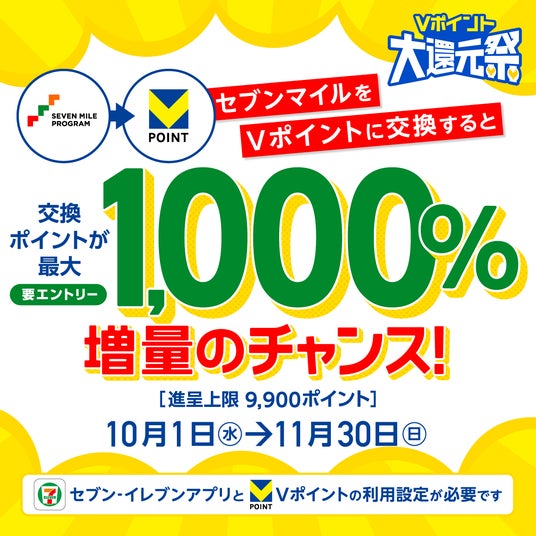 株式会社セブン-イレブン・ジャパン(本社:東京都千代田区、代表取締役社長:阿久津 知洋、以下「セブン-イレブン」)と、CCCMKホールディングス株式会社(本社:神奈川県横浜市、代表取締役社長兼CEO:高橋 誉則、以下「CCCMKHD」)および三井住友カード株式会社(本社:東京都江東区、代表取締役 社長執行役員 CEO:大西 幸彦、以下「三井住友カード」)は、セブン-イレブンとVポイントが2024年10月の協業開始から1周年を迎えることを記念し、2025年10月1日(水)から2025年11月30日(日)まで、全国のセブン-イレブンでのご利用で最大1,000%のVポイントが還元されるキャンペーン「Vポイント大還元祭」を開催いたします。