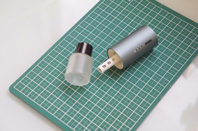 ガラスのボトルにアロマオイルを注いだら、充電済みの本体とドッキングしましょう。