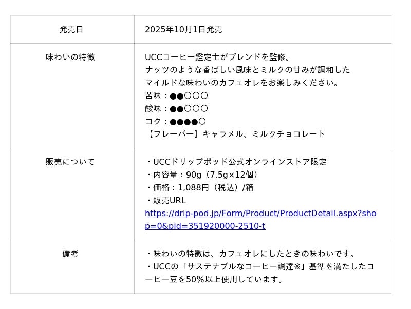 今回は、そうしたシリーズのコンセプトを踏襲し、さらに、秋から冬にかけて寒さが深まる夜にゆっくりと飲むシーンをイメージして、優しい甘さのあるカフェオレの味わいをお楽しみいただける味わいに仕上げました。ブラジルの「コーヒーの新年」にちなんで制定された記念日、国際コーヒーの日である10月1日(水)より、UCCドリップポッド公式オンラインストアにて発売いたします。