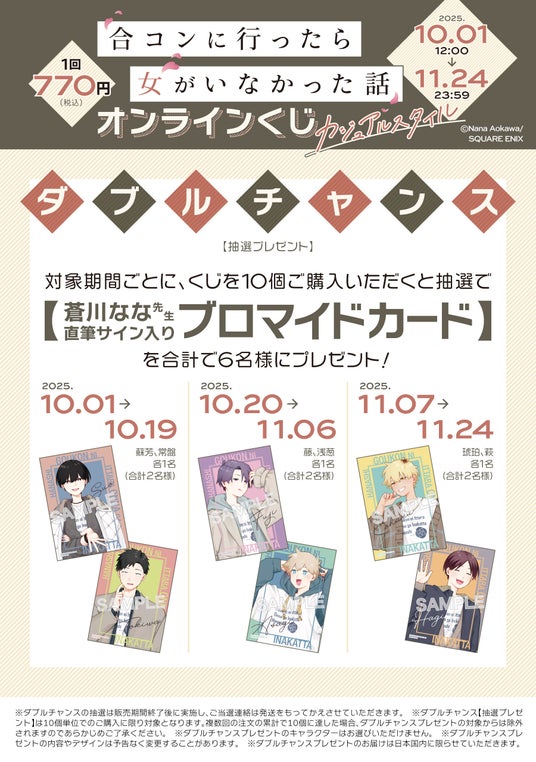 本日2025年10月1日正午より、スクウェア・エニックス e-STOREにて『合コンに行ったら女がいなかった話』(蒼川なな先生)のオンラインくじの予約受付が開始いたしました。