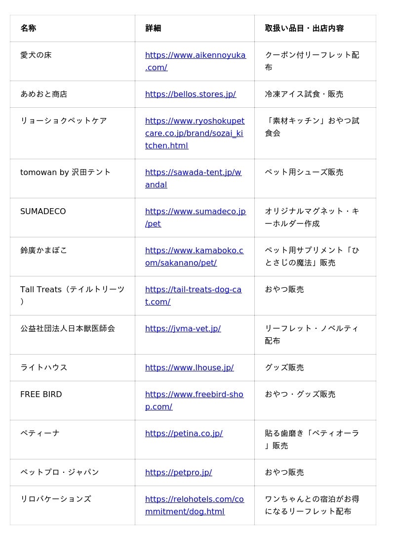 水分補給やご褒美アイテムなど、愛犬と快適に観戦を楽しめる商品を販売します。今回は前回よりもさらに多くの出店ブースが登場!サンプル配布を行っているブースも多数ございますので、ぜひお気軽にお立ち寄りください。