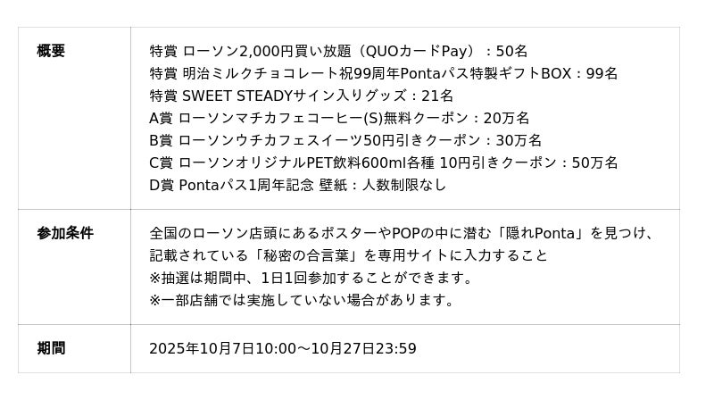 本キャンペーンでは、「『隠れPontaを探せ』キャンペーン」として、全国のローソン店頭で「隠れPonta」が書かれているポスターや店頭広告などを見つけ、「隠れPonta」に記載の秘密の合言葉を、特設サイトで入力すると、ローソンで使える2,000円分のQUOカードPayや、マチカフェコーヒー(S)無料クーポン、明治ミルクチョコレートが入った特製ギフトBOX、Pontaパスのアンバサダーを務めるアイドルグループ「SWEET STEADY」のサイン入りグッズなどが合計100万人以上に当たる抽選に参加できます。また、SNSでのキャンペーンや、「au PAY マーケット」「menu」などの各サービスで使える1周年記念のサービスも順次提供します。