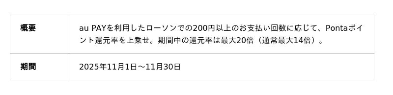 さらに2025年11月からは、ローソンでのお買い物にau PAYを利用すると、Pontaポイント還元率が最大20倍(通常最大14倍)(注1)になるキャンペーンも実施します。