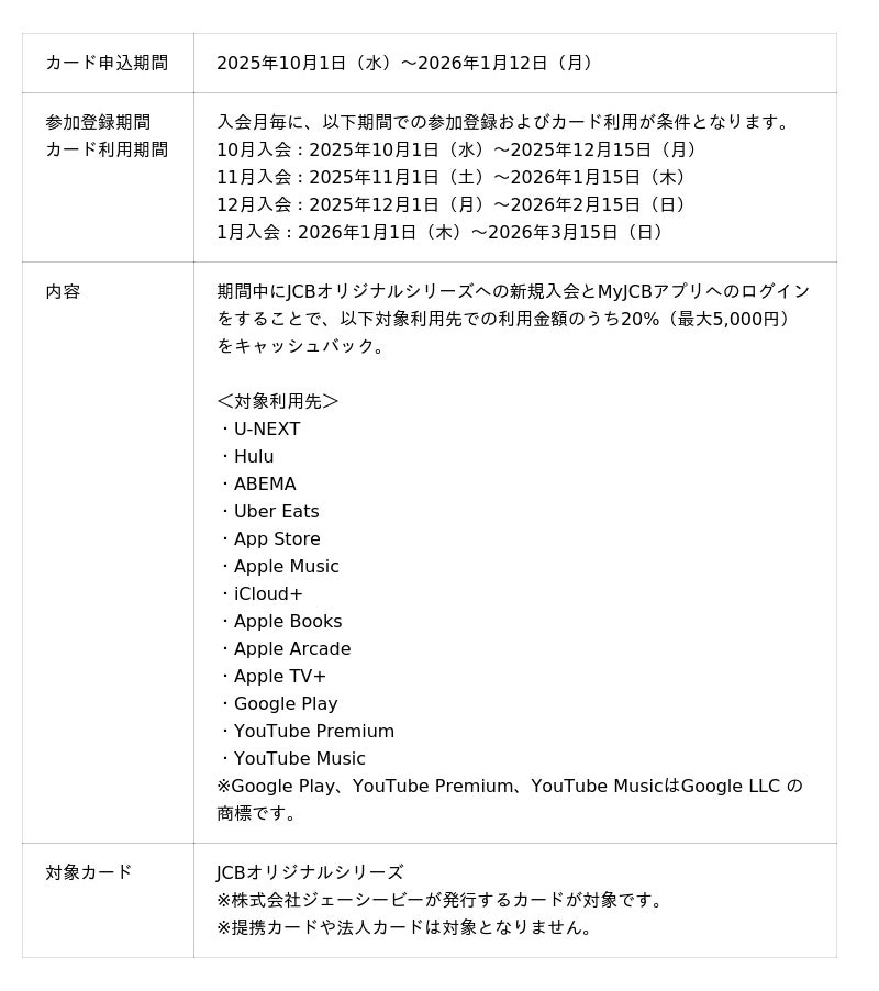 株式会社ジェーシービー (本社:東京都港区、代表取締役会長兼執行役員社長:二重 孝好、以下:JCB)は、2025年10月1日(水)から2026年1月12日(月)の間、「JCBオリジナルシリーズ新規入会者限定サブスク・デリバリー・アプリをおトクに!20%キャッシュバックキャンペーン」を実施します。