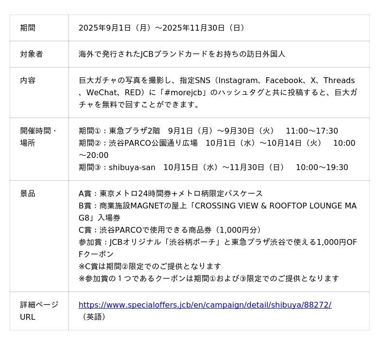 本イベントは、「日本をもっとお得に!もっと楽しく!」(MORE JAPAN)をキーワードに、訪日観光客に人気の渋谷エリアの会場(東急プラザ渋谷、渋谷PARCO、shibuya-san)にて開催され、海外のJCBカード会員様なら誰でも無料で体験いただけます。参加者は、ガチャマシーンの写真を撮影し、SNSに「#morejcb」を付けて投稿することで、豪華景品が当たるチャンスを得られます。