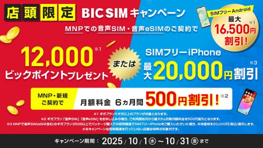 ビックカメラグループが提供する「BIC SIM powered by IIJ(以下、BIC SIM)」は、ビックカメラグループ店舗限定で、新型iPhone 17シリーズを含むSIMフリーiPhoneを最大20,000円割引、人気の最新Android端末も最大16,500円割引、またはBIC SIMの月々のお支払いにも利用できるビックポイントを12,000ポイントプレゼントします。