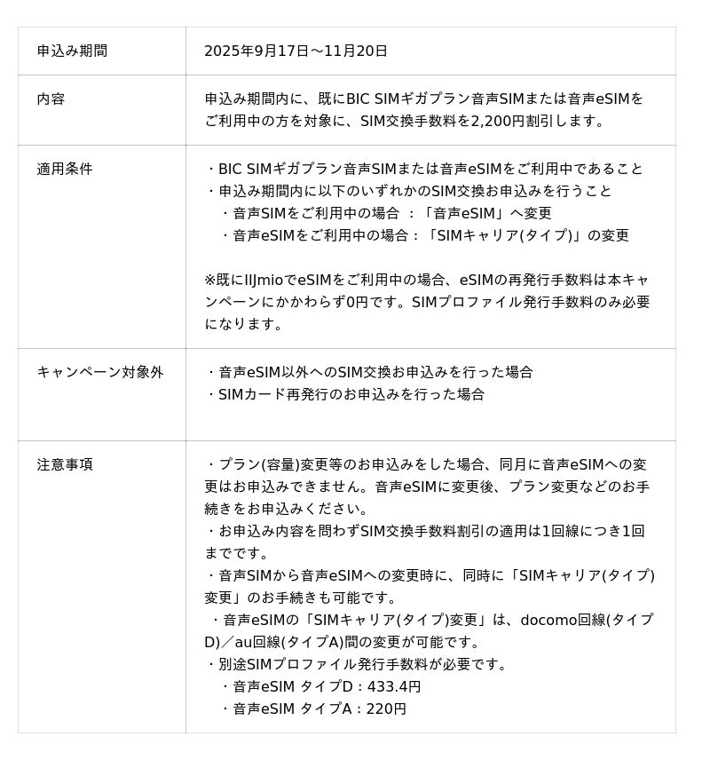 さらに、既にBIC SIMをご利用いただいている方向けに、2025年11月20日までの期間限定で、eSIMへの変更手数料が0円になるキャンペーンを実施しています。新型iPhoneをご検討中の方はこの機会をお見逃しなく!