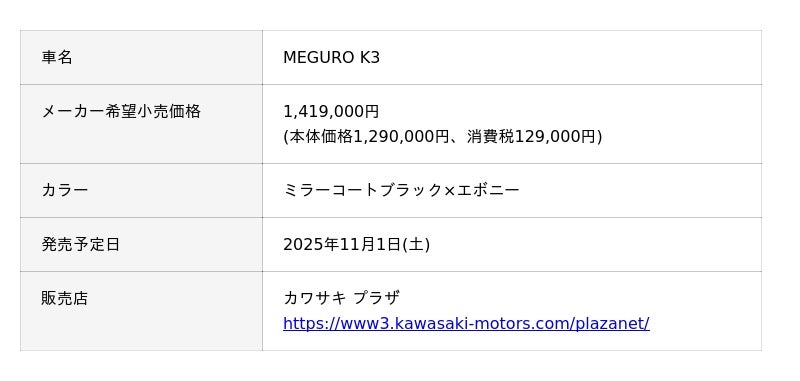 株式会社カワサキモータースジャパン(本社:兵庫県明石市、代表取締役社長:佐伯 健児)は、カラー&グラフィックを継続して、2025年11月1日(土)に「MEGURO K3」発売いたします。