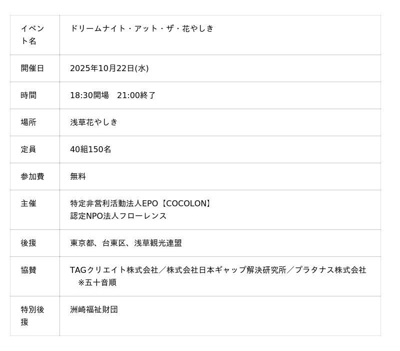 重症心身障がい児のと家族や支援者向けに学び・遊び・情報を提供をする「COCOLON」(運営:特定非営利活動法人EPO、東京都江戸川区、代表:齋藤えりか)は、認定NPO法人フローレンス(東京都千代田区、代表理事:赤坂 緑)と共同で重症心身障がい児と家族対象のイベント「ドリームナイト・アット・ザ・花やしき」を開催します。