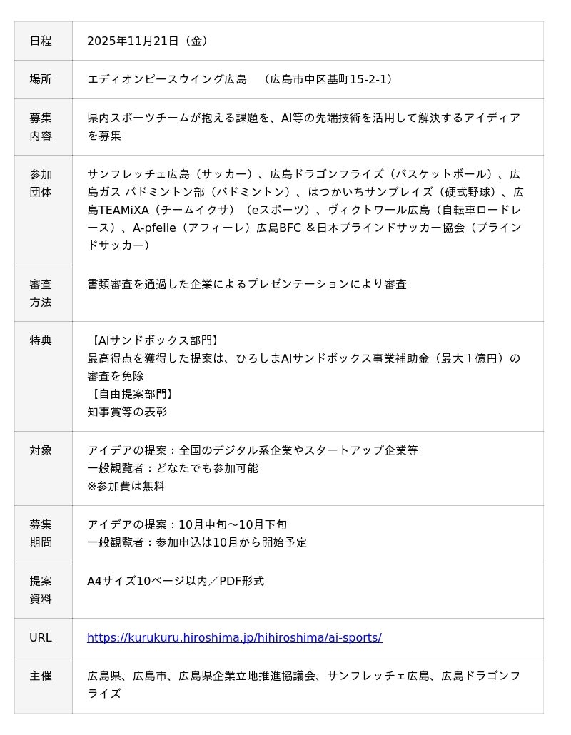 また、11月21日(金)には、サンフレッチェ広島や広島ドラゴンフライズ等と連携したメインイベント「ひろしまSPORTS×TECH指名会議2025」を開催します。このイベントは、県内のスポーツチームが抱える課題を、AI等の先端技術を活用して解決するアイディアを全国のスタートアップ等から募集し、県内スポーツチームと企業をマッチングするものです。