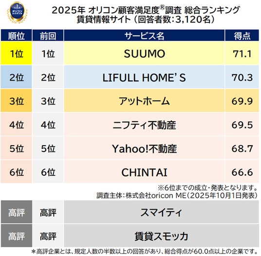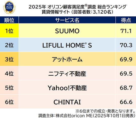 『賃貸情報サイト』総合ランキング(2025年 オリコン顧客満足度(R)調査)