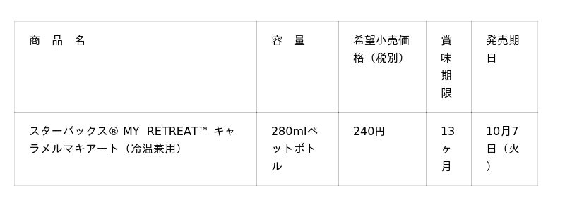 スターバックス・コーポレーション(本社:米国 シアトル、CEO:ブライアン・ニコル)と、サントリー食品インターナショナル株式会社(本社:東京都、社長:小野真紀子)は、ペットボトル入りコーヒーの新シリーズ「スターバックス(R) MY RETREAT(TM) キャラメルマキアート」を、全国の自動販売機限定で10月7日(火)から発売します。スターバックスから自動販売機限定商品が登場するのは今回国内で初の取り組みです。