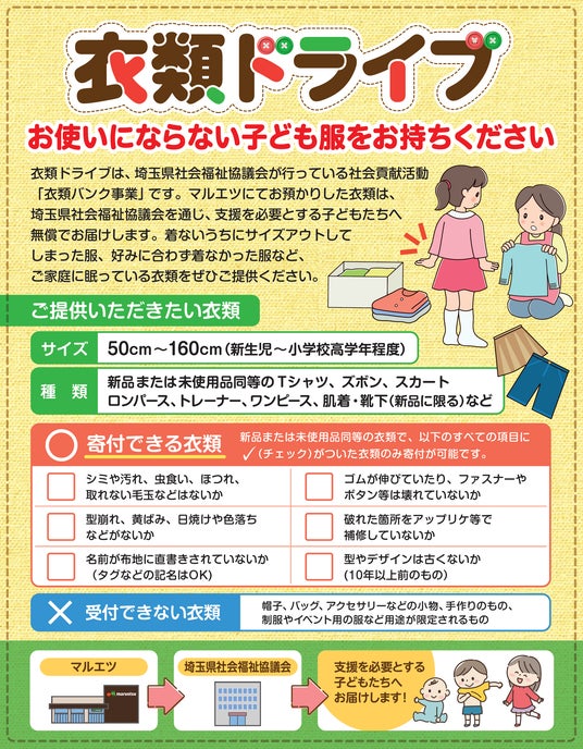 マルエツは、支援を必要としている子どもたちに、埼玉県社会福祉協議会(以下、埼玉県社協)を通じて衣料品を届ける「衣類ドライブ」を、10月10日(金)から10月23日(木)の14日間、埼玉県内の5店舗(朝霞店、岩槻駅前店、佐知川店、三郷中央店、蕨北町店)で実施します。
