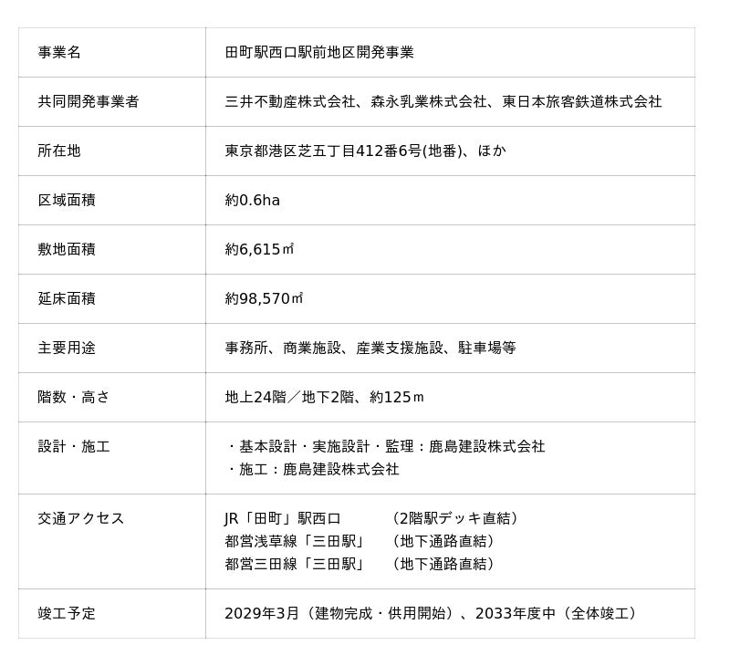 三井不動産株式会社(本社:東京都中央区、代表取締役社長:植田 俊、以下「三井不動産」)、森永乳業株式会社(本社:東京都港区、代表取締役社長:大貫 陽一)、東日本旅客鉄道株式会社(本社:東京都渋谷区、代表取締役社長:喜㔟 陽一、以下「JR東日本」)は、「田町駅西口駅前地区開発事業(以下「本事業」)」が2025年10月1日に着工し、本日起工式が執り行われたことをお知らせします。なお、本事業は、1期工事として2029年3月末に建物が竣工し、2期工事として2033年度に緑地広場の整備を実施し、全体竣工を迎える予定です。