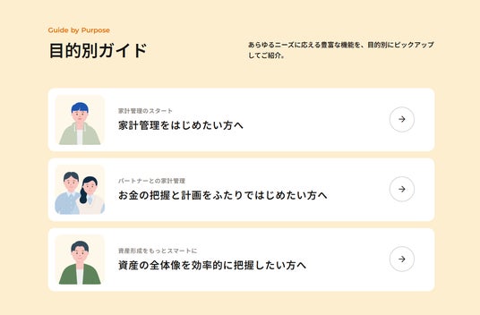 これまでのサービスサイトにはなかった、家計・資産管理の目的に応じたサービスガイドを新たなコンテンツとして追加。様々なニーズに応える『マネーフォワード ME』の機能を目的別にピックアップして紹介することで、家計・資産管理を始める方を後押しします。